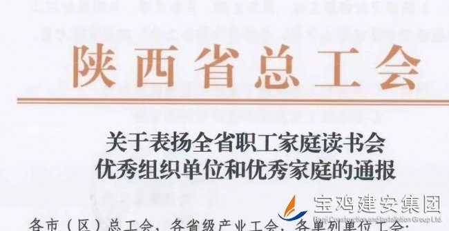 另據(jù)消息,在第28個(gè)“世界讀書日”到來之際,由市總工會推薦的全市職工讀書活動兩個(gè)代表家庭,被陜西省總工會授予全省優(yōu)秀單位稱號,寶雞建安集團(tuán)工會成為代表全市職工讀書活動中的典型表率之一,受到全省通報(bào)嘉獎(jiǎng),為寶雞贏得了榮譽(yù)。